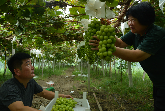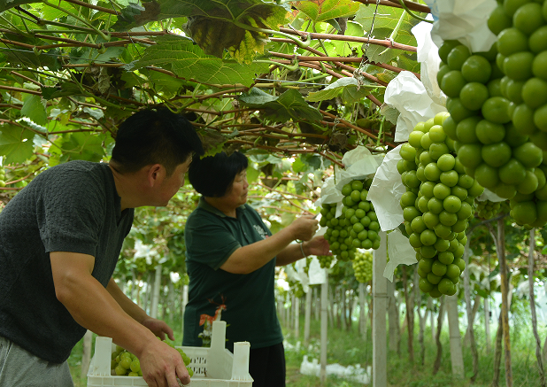 8月13日,宿州市埇桥大营镇镇东村,葡萄种植大户刘导采摘发往北京新发地市场的订单阳光玫瑰葡萄。初秋时节,被誉为皖北果蔬小镇大营镇近万亩阳光玫瑰葡萄陆续成熟,吸引全国各地客商前来收购。近年来,大营镇通过党建引领,采取党组织+合作社(农业公司)+农户的方式,大力发展以夏黑、玉波二号、阳光玫瑰等品种的葡萄为主,辅以草莓、西瓜、莴苣、丝瓜生产的设施农业2万余亩,成就了皖北地区知名的“果蔬小镇”,年实现产值3亿多元,有力加快了乡村振兴步伐。