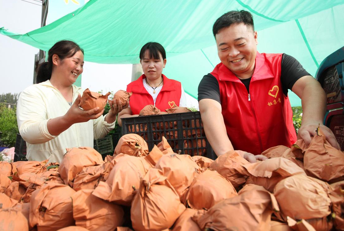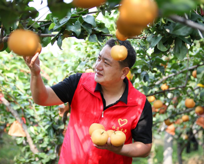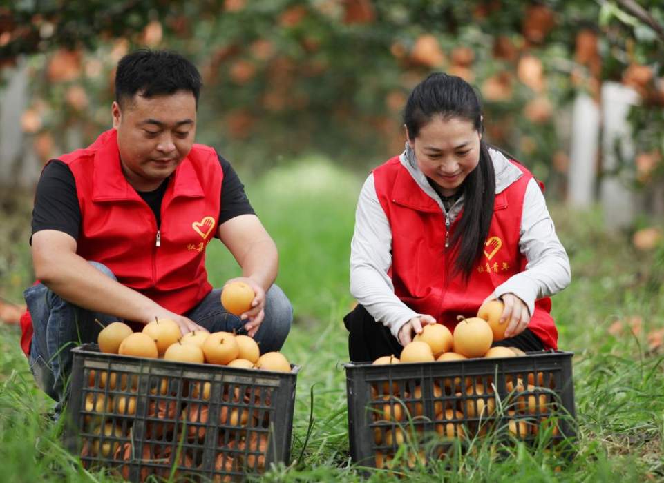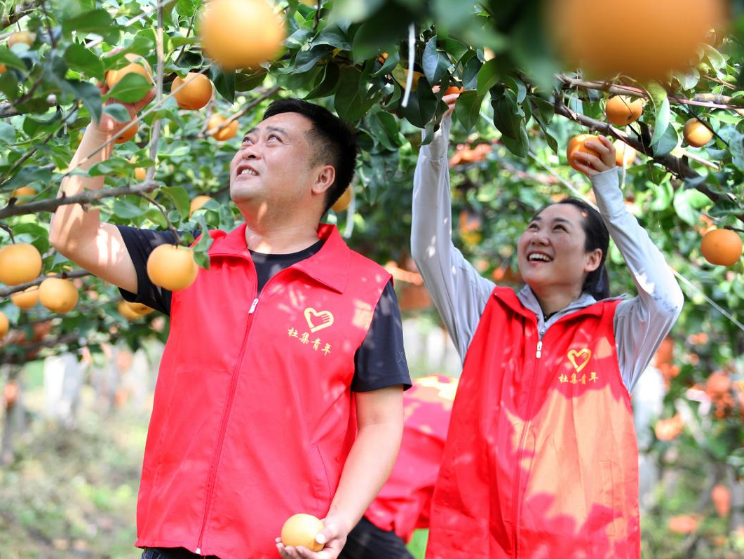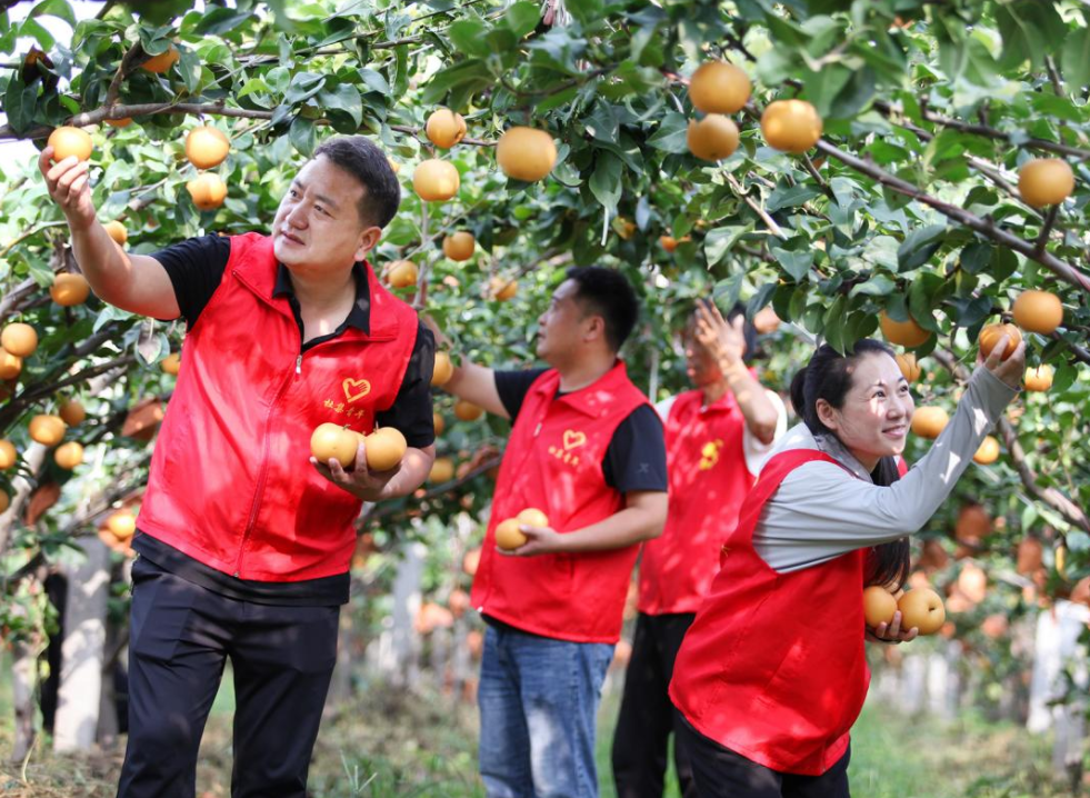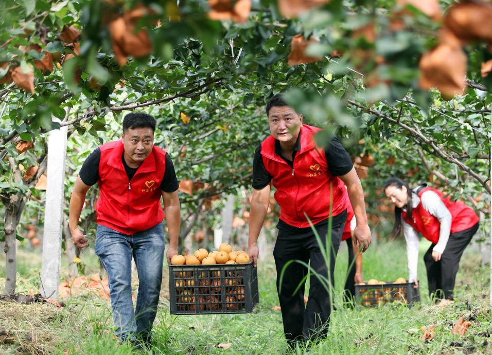 近年来,安徽省淮北市杜集区矿山集街道坚持党建引领,采取“村党支部+集体经济合作社+农户”模式,通过严格落实惠农政策,整合土地资源、资金,持续推进特色产业种植,沿淮北市东外环矿山集街道路段打造集果蔬采摘、休闲旅游、教育研学为一体的农文旅经济带,在做优特色农产品牌的同时,还促进了农民增收致富,为乡村振兴注入强劲动力。图为9月上旬,矿山集街道南山村黄金蜜梨进入成熟期,党员志愿者走进果园,帮助果农采摘、搬运、分拣蜜梨,准备供应市场。