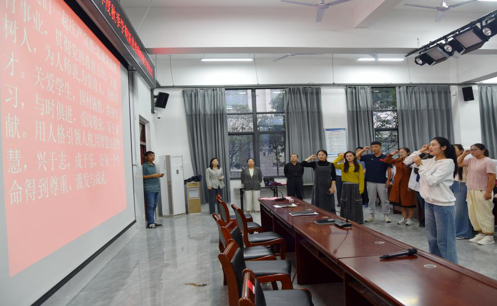 在青年教师丁琳带领下,大家一起宣誓,承诺要忠诚党的教育事业,贯彻党的教育方针,立德树人,为人师表,为党育人,为国育才;关爱学生,因材施教,终身学习,与时俱进,爱岗敬业,乐于奉献;用人格引领人格,用智慧点亮智慧,兴于志,成于乐,让每一个生命得到尊重、激发与成就。