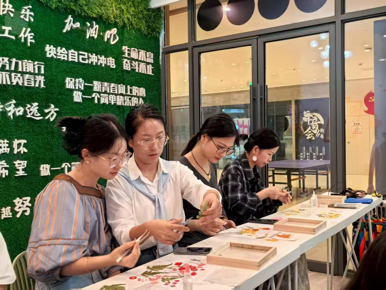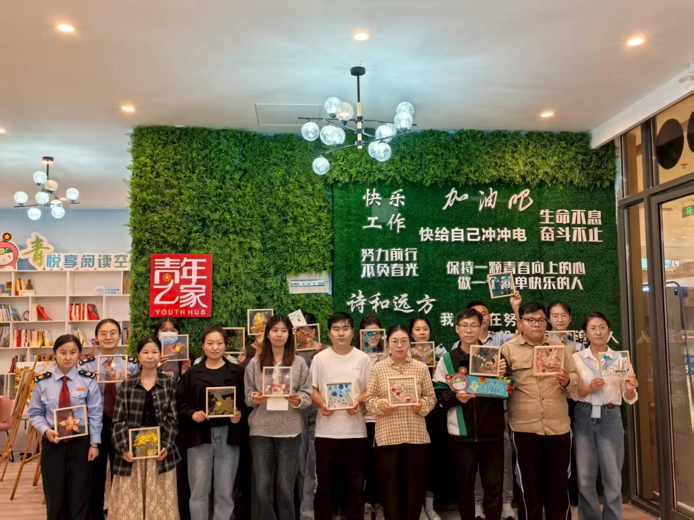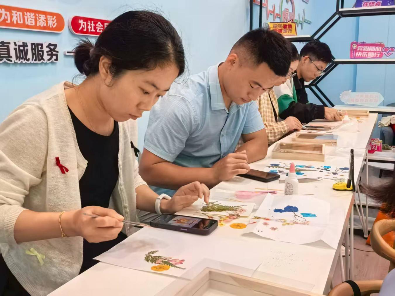 在实践环节,青年们迫不及待地动手创作。每个人桌前都配备了各式花瓣、叶片和制作工具,大家在张老师的指导下细心挑选材料,精心构思布局,将一朵朵干燥花卉巧妙组合成独具匠心的画作。现场氛围轻松而专注,有的以淡雅的雏菊、绿叶为素材,勾勒出清新自然的田园图景;有的大胆搭配色彩明艳的花朵,打造出富有现代感的艺术图案。大家相互交流创意技巧,分享制作心得,在传统文化的浸润中增进了友谊。