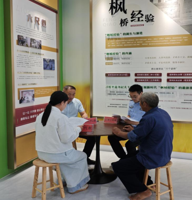 “红巷议事堂”不搞“花架子”,把阵地建设和文化浸润摆在首位。展厅墙面上,“六尺巷”工作法中“谦和礼让、换位思考”的理念图文并茂,新时代“小事不出村、大事不出镇”的枫桥经验清晰呈现,二十四孝道文化故事生动鲜活,让群众一进门就感受到“和为贵”的氛围。同时,现场配置圆形会议桌、专属桌牌和便民座椅,打破“上下级”“群众”隔阂,不设高低位,大家围坐在一起像“拉家常”一样说事,从“要我参与”变成“我要参与”,让议事堂真正成为群众愿意来、坐得住、能说事的“暖心巢”。