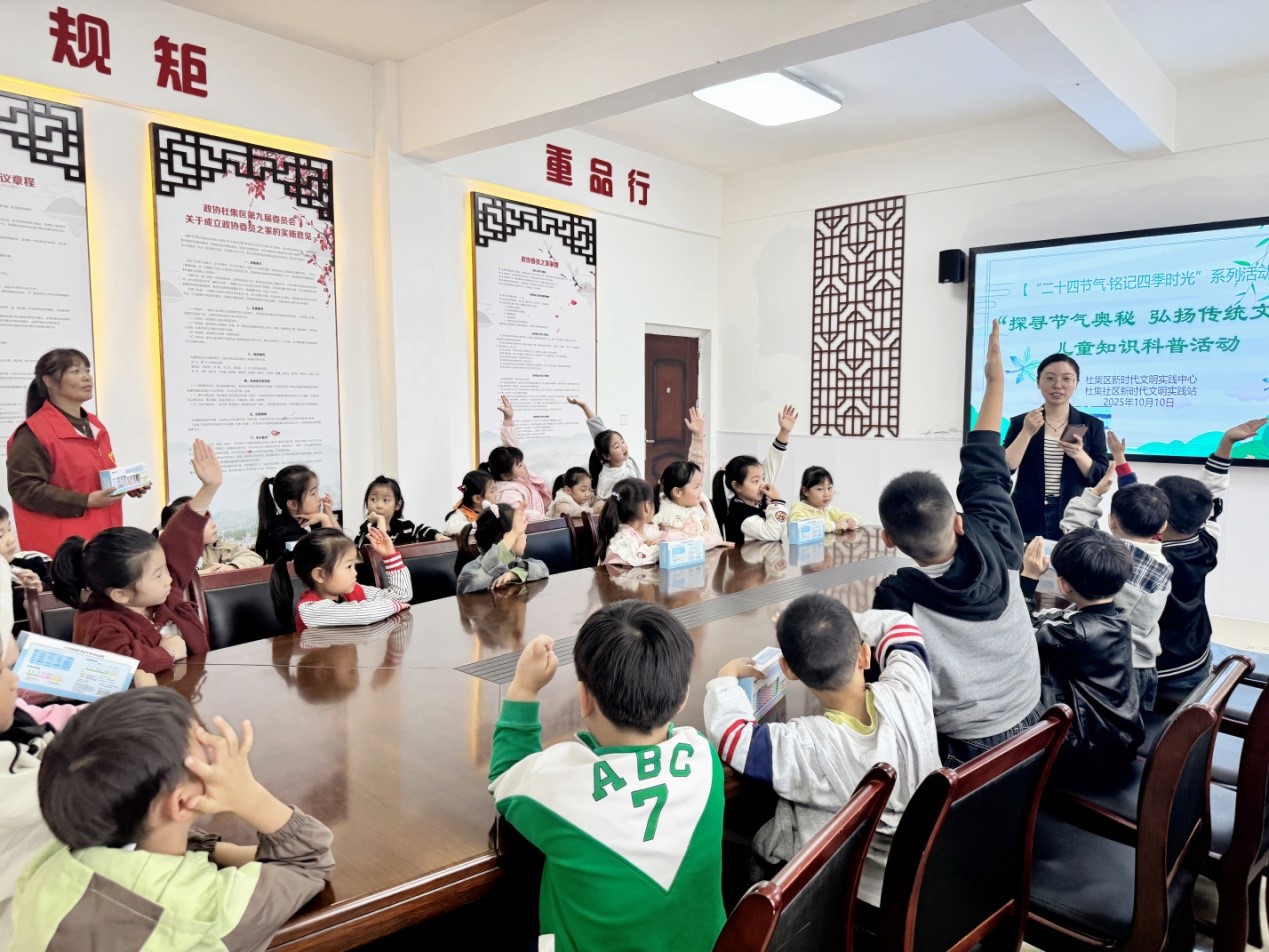 “清明忙种麦,谷雨种大田”“霜降变了天,寒露忙收棉”……近日,淮北市杜集区矿山集街道杜集社区内传来阵阵稚嫩的诵读声,一场以“探寻节气奥秘 弘扬传统文化”为主题的儿童科普活动在此热闹开展。这场活动由杜集区委宣传部、区新时代文明实践中心主办,杜集社区新时代文明实践站承办,吸引了辖区30 余名儿童踊跃参与,旨在让孩子们深入了解中华优秀传统文化,感受二十四节气中蕴含的自然智慧与生活哲学。
