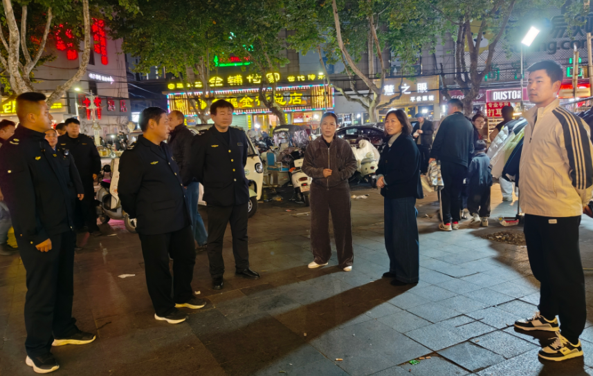 夜幕下的国购广场灯火璀璨,街道环保站工作人员、社区居委会干部与国购广场物业人员一同在现场巡查。张秀珍书记详细询问了前期群众反映问题的整改措施落实情况,重点查看了商贩经营区域的环境卫生、噪音管控等方面的改进成效。