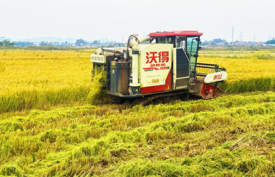 金秋时节,淮北市杜集区段庄村的田野间一派繁忙景象——收割机穿梭在金黄的稻田里,轰鸣声中,饱满的稻穗被尽数卷入机身,一颗颗长粒饱满的稻谷倾泻而出。