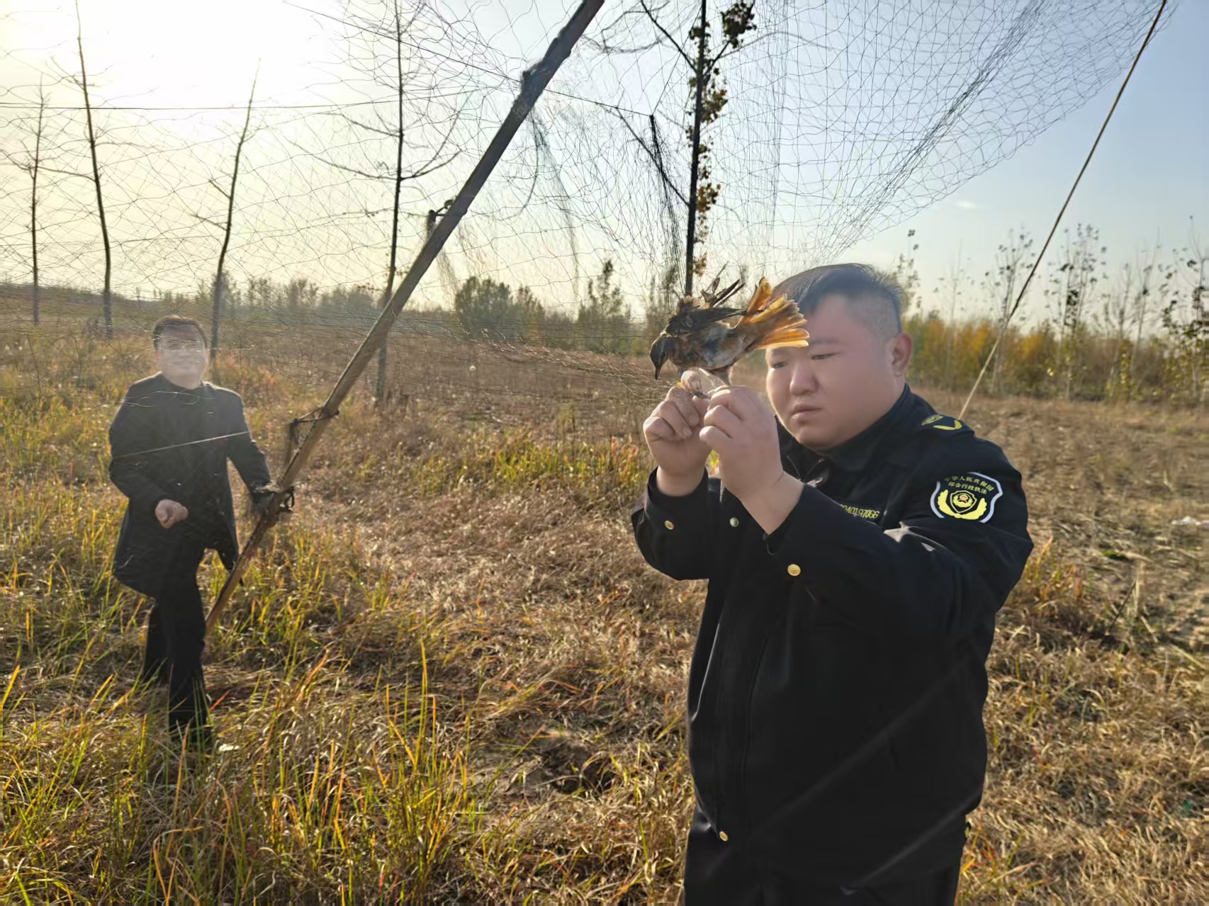 行动中,工作人员发现部分鸟网设置极为隐蔽,在镇东的故黄河沿岸上,三张长达20米的粘网赫然挂在枝头,网上缠绕着多只受困的鸟类,其中部分已死亡。执法人员立即解救存活鸟类并放生,同时对现场进行取证,后续将依法追查违法行为。