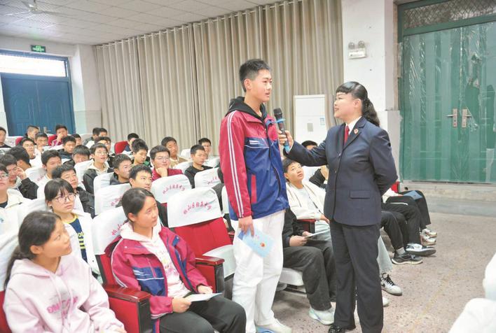 考虑到中学生的认知特点,朱溟还设计了情景问答、法治小测试等互动环节。“有人故意损坏我的东西,我该怎么维权?”“明知同学聚众斗殴而提供作案工具是否要承担刑事责任?”……通过这一系列启发性问题,同学们在思考和讨论中自己得出正确答案,深化对行为后果的认识。现场互动频繁,掌声与沉思交织。同时,检察官叮嘱同学们要树立法治意识,明辨是非边界,遇到问题及时向老师、家长或检察官求助,学会用法律武器保护自己。