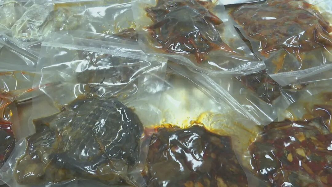 企业负责人张毛莉向记者介绍:"溢洲食品主要做的产品有甲鱼和鸡,还有其他十来个品种,每天甲鱼产量大概5000多份,鸡和鹅这些在2000到3000份左右。"她特别提到企业的产业链优势:"公司还有一个甲鱼初加工项目在附近,其中的宰杀加工生产线是全自动生产线,甲鱼放进去,每分钟能处理50只,日产量在5000到10000只,效率非常高,能够供给食品厂现杀现做。"这种完整的产业链布局,正是现代化产业体系在食品加工领域的具体体现。
