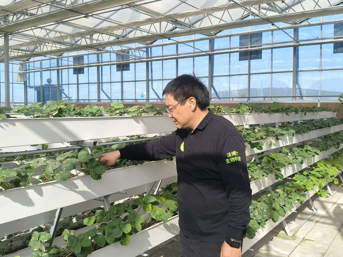 图为屏山镇蚯蚓生态循环产业示范园负责人王玉平在示范田里检查立体草莓的生长情况。王宝林 摄