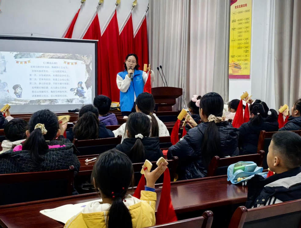 “假如你是小军师,面对刘备的多次邀请,你会如何抉择?”“典故新说”环节,老师以动画、文物图片搭配生动讲解,再现“三顾茅庐”典故,通过情景提问引导孩子们领悟坚持与诚信的意义,分享心中的英雄形象。原创快板《古今少年说》将“三顾茅庐”的历史佳话与现代韵律巧妙结合:“竹板响,震天响,三顾茅庐传佳话……”唱词朗朗上口。孩子们在打板练习、“快板接龙”中跟着节拍互动,在欢快的氛围里轻松牢记知识点,让传统文化趣味传承。