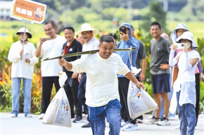 9月23日,黄山市祁门县安凌镇芦荔村,农民运动员在比赛中。当日,一场别开生面的农民趣味运动会在黄山市祁门县安凌镇芦荔村举行,来自18支乡镇代表队的农民选手们在拔河、割稻子、扁担接力等充满乡土气息的项目中挥汗如雨,在欢声笑语里共庆丰收佳节。施亚磊 张妍