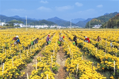 2025年10月28日,菊农在安徽省黄山市歙县溪头镇桃源村采摘金丝皇菊。金秋时节,安徽省黄山市歙县溪头镇千亩金丝皇菊陆续进入采摘期,农民趁着晴好天气采摘菊花,确保丰产丰收。近年来,歙县依托土地以及乡村旅游资源,发展观赏性强、经济价值高的金丝皇菊种植,引导企业延长产业链,深加工菊花产品,提高附加值,带动农民增收,推动农旅融合发展。