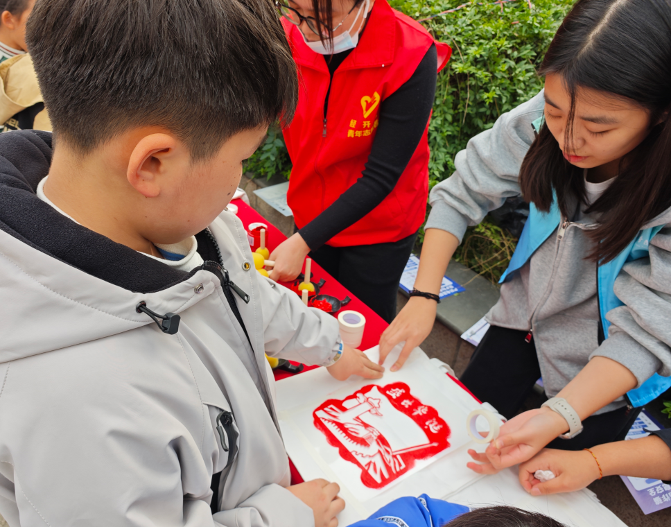“传承”区域洋溢着浓厚的红色氛围与亲自动手的乐趣。在红色手工拓印体验点,小朋友们和大朋友们在志愿者的耐心协助下,认真挑选自己心仪的拓版——无论是壮丽山河的祖国美景,还是寓意美好的盛世华诞图案,都被他们亲手拓印到帆布包上,成为独一无二的红色印记作品。