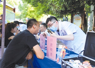 口腔科专家为社区居民检查牙齿