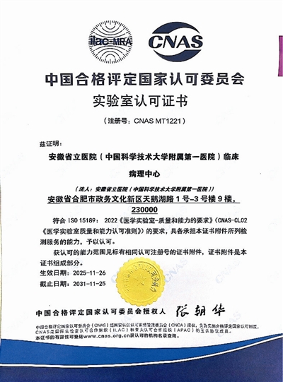 市场星报、安徽财经网(www.ahcaijing.com)讯 (记者 马冰璐 通讯员 陈晶晶 刘洋 周杭城) 12月15日,记者获悉,中国科大附一院临床病理中心日前成功通过中国合格评定国家认可委员会(CNAS)的严格评审,荣获ISO 15189医学实验室认可证书。这标志着该院病理诊断的质量管理与技术能力正式接轨国际先进水平,其出具的检测报告将获得更广泛的国际认可。