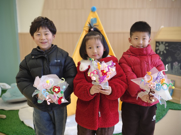 璀璨班的小朋友发挥奇思妙想,将扭扭棒弯绕、组合,制作出一束束娇艳的花束。拿着亲手制作的花束,孩子们脸上洋溢着纯真的笑容,迫不及待地要把这春日般的美好礼物送给最爱的她。