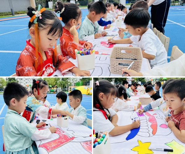 大班的哥哥姐姐们以“长卷绘祖国”的形式,用画笔描绘对祖国的美好想象。操场上,一卷长长的画布徐徐展开,孩子们手持画笔,神情专注地勾勒着画面:有雄伟的天安门、蜿蜒的长城,有鲜艳的五星红旗,还有充满生机的花草树木。他们用丰富的色彩、大胆的创意,将对祖国的认知与热爱融入画作中。画笔舞动间,一幅充满童趣与活力的“祖国画卷”逐渐成形,每一笔都饱含着孩子们对祖国妈妈最深的祝福。