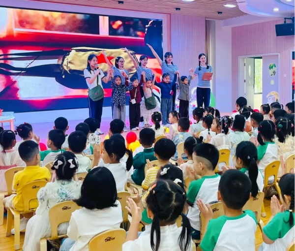 大班年级组以“阅”为桥梁,联结红色经典与中秋元素,通过故事演绎深化幼儿对“家国团圆”的认知。小朋友和老师们共同演绎了红色故事《红红的小挎包》,大屏展现七八十年代幼儿园场景,小主人公红红与“过去的孩子”展开对话,通过旧布包与亮面新挎包的对比,呈现不同时代孩子的快乐。剧中,过去的孩子们用旧挎包装载简单物品,玩出无限乐趣;现代孩子则对亮晶晶的新挎包充满好奇,装着对知识的渴望。教师们深情讲述,强调珍惜当下,传承红色基因。活动尾声,孩子们齐声高呼:“红红的挎包,红红的爱,我们一起传下来!”红色情景剧不仅让孩子们感受了童真与快乐,更激发了他们的爱国情怀。