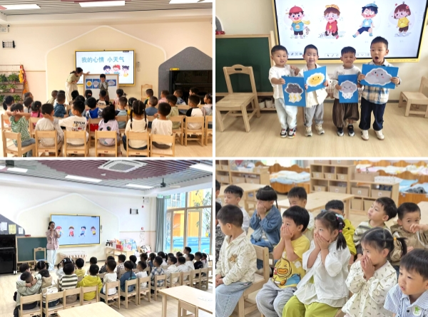 活动现场,各班级结合幼儿年龄特点设计专属内容,画面鲜活又治愈。小班开展《我的心情小天气》活动,老师手持色彩鲜亮的“天气表情牌”,孩子们围坐成圈,认真挑选贴合自己当天心情的卡片,有的举着“太阳牌”笑着说“今天妈妈送我来幼儿园,我很开心”,有的拿着“乌云牌”轻声分享“昨天玩具坏了,我有点难过”;随后的“情绪传递”游戏更让教室充满笑声,孩子们或皱着小眉头模仿“生气”,或捂着胸口做“害怕”模样,用稚嫩的表情和动作将情绪传递给同伴,在互动中轻松认识常见情绪。