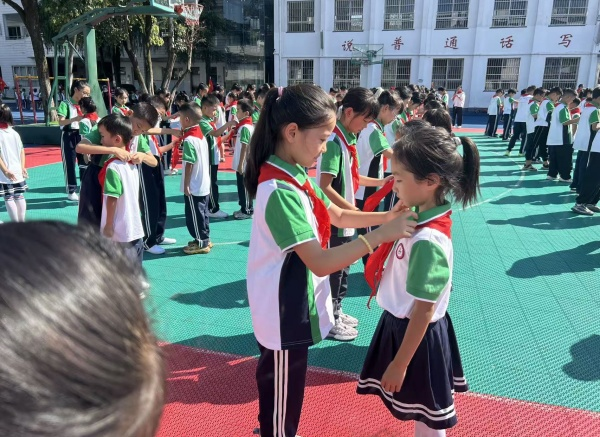 仪式尾声,校长走上讲台发表寄语。他首先向新入队的队员表示祝贺,随后回顾少先队的光荣历史,勉励全体队员:“红领巾是红旗的一角,承载着革命先辈的期望。希望你们以‘四比四赛’为起点,把规范礼仪融入日常,把坚定信念刻进心里,在学习中增长本领,在实践中锤炼品格,真正成为赓续红色血脉的‘时代先锋’,让红领巾在胸前永远鲜艳!”