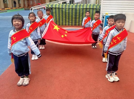 担任本次升旗手的是来自中一班的小朋友。看!他们迈着整齐的步伐,托举着神圣的五星红旗向升旗台走去,随着国歌奏响,升旗手缓缓拉动绳子,在嘹亮的国歌声中,五星红旗冉冉升起,全体师生行注目礼,齐声高唱国歌,表达对祖国的崇高敬意。