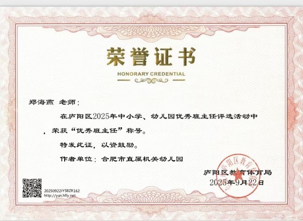 2025年9月22日,合肥市直属机关幼儿园郑海燕老师荣获“庐阳区优秀班主任”荣誉称号。