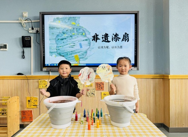 在绘制漆扇环节,教师手持素面漆扇进行示范,讲解基础绘画步骤,鼓励幼儿发挥想象,加入自己喜欢的元素。孩子们在扇面上点缀色彩,或描摹秋菊,或勾勒祥云,或用斑斓的色块表达心中的爱与感恩。一柄柄独一无二的漆扇,在幼小的手中渐次绽放,成为传递孝心的美丽信物。