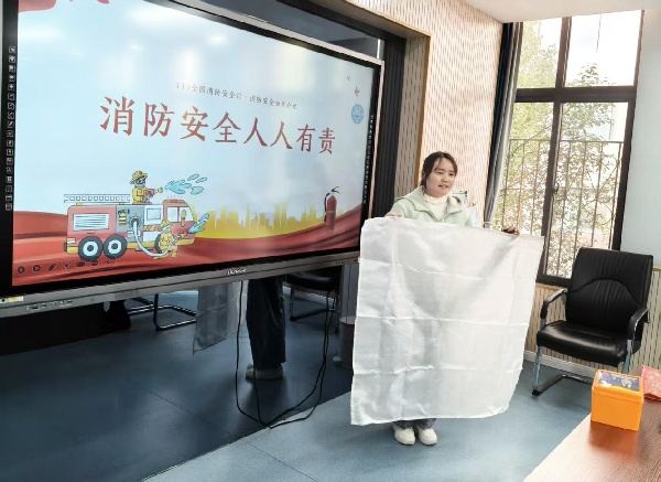 随后,培训聚焦常用的消防器材——消防毯与呼吸面罩,展开重点培训。针对消防毯,详细演示了“快速取出、抖开覆盖、隔绝火源”的操作流程,明确其在扑救初期小火、覆盖身体逃生等场景的使用要点;对于呼吸面罩,通过“打开包装、佩戴面罩、检查密封、正常呼吸”的步骤拆解,让教职工掌握正确佩戴方法,了解其过滤有毒烟雾、延长逃生时间的核心作用,确保大家在紧急情况下能快速上手、规范使用。
