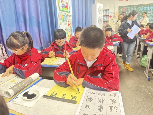 比赛现场秩序井然,墨香氤氲。二年级专属硬笔组的小选手们坐姿端正、握笔规范,一笔一划认真书写经典诗文,字迹工整清秀,卷面整洁美观;三至六年级毛笔组的同学们则凝神静气,提按顿挫间尽显功底,在宣纸上挥洒笔墨,将经典诗文的韵味与汉字的线条美完美融合。此次比赛以班级为单位组队参与,既考验学生的书写水平与文化感悟,更凝聚了班级向心力,展现了各班级的整体风采。