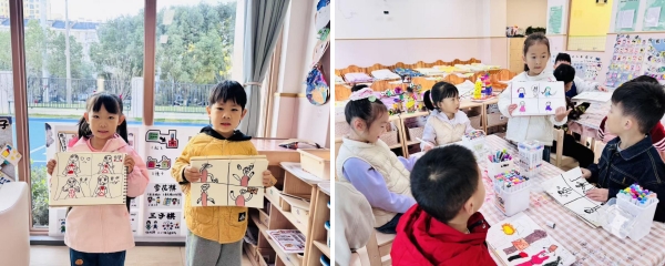 大班幼儿以“我的心情日记”为主题,开展绘画创作活动。教师以“如果你的心情可以用一页日记来记录,它会是什么颜色、什么形状?里面会发生什么样的故事”为引导,鼓励幼儿将内心的感受转化为具体的视觉符号和画面,运用变化的线条和独特的构图,将开心、平静、兴奋和小烦恼等情绪,凝固成一幅幅充满个性的“日记画页”。
