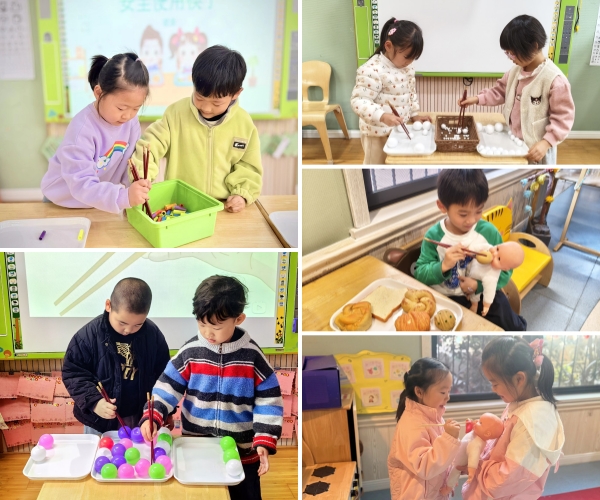 “筷子练习角”里热闹非凡,孩子们迎来了“筷”乐闯关游戏。第一关“夹‘大’东西”,大家用筷子将棉花球、纸团、大积木等物品从一个碗运到另一个碗,专注地体验“夹”与“放”的基本动作;第二关“给娃娃喂食”,孩子们夹起仿真食物,小心翼翼地喂给张着嘴的娃娃,脸上满是认真与喜悦;第三关“小小分拣师”,小组竞赛火热开展,孩子们快速用筷子将混合的玩具按种类、颜色分类,在比拼中提升了夹取的速度与准确率,欢声笑语不断。