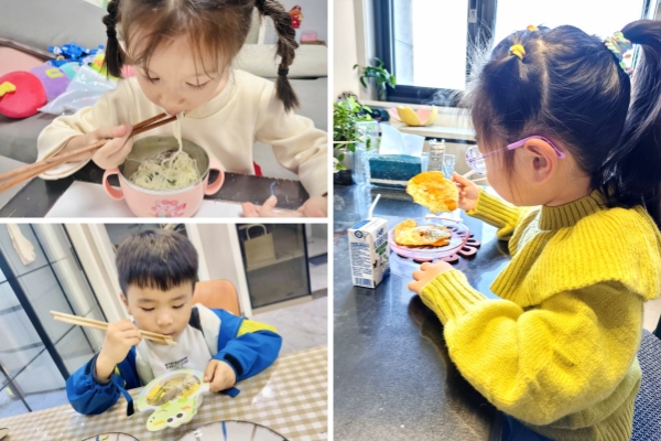除了在园的练习,孩子们还将用筷技能延伸到了家庭生活中。在家用餐时,他们主动拿起筷子尝试夹取饭菜,从最初夹起米饭、青菜,到慢慢能熟练夹起肉块、豆类,进步十分显著。家长们也纷纷在班级群里分享孩子们自主用筷的可爱瞬间,照片中,孩子们握着筷子认真吃饭的模样,满是自信与专注,赢得了老师和其他家长的纷纷点赞。