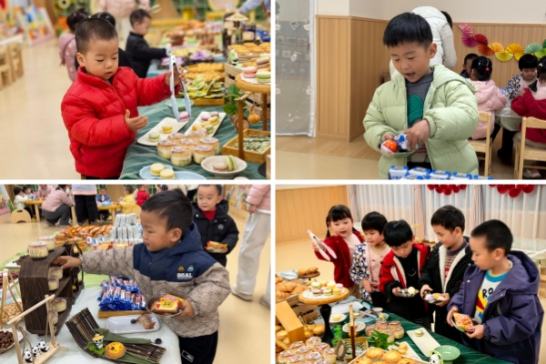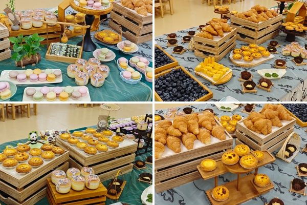 各式各样的精致点心、新鲜水果与香酥小吃被分门别类整齐摆盘。老师们用彩色装饰布置环境,让整个场地温馨又充满童趣,每道菜品都凝聚着老师们满满的用心。