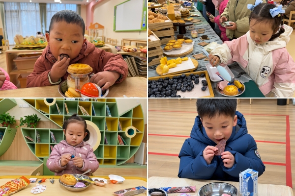 孩子们围坐在一起,餐盘里装满了香甜软糯的布丁、清爽脆口的水果和奶香四溢的奶酪棒,这满满当当的美味色彩缤纷、食欲大开。