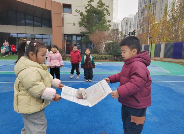 户外时间,一场热闹的报纸运球比赛拉开帷幕。孩子们两人一组,各自拉住报纸的两侧,让纸团稳稳待在报纸中间,小心翼翼地向终点的筐子移动。大家喊着整齐的口号调整节奏,既要防止纸团掉落,又要加快前进速度,在欢声笑语中,孩子们的协作能力与肢体协调性得到了充分锻炼。
