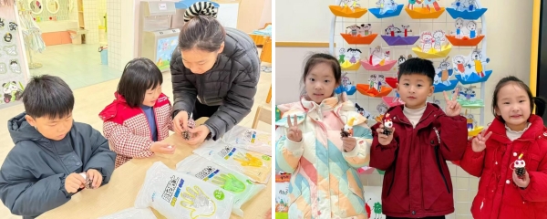 中班的探索小队深入花坛、自然角。在团员老师的陪伴和提示下,孩子们细心收集落叶、花瓣、小石子等自然物,并发挥想象力,将这些材料拼贴成富有童趣的小雪人、小松鼠等小小艺术品。活动不仅让孩子们感受了自然材料的形态与质感,更在实践中萌发了珍惜自然、创造美的情感。