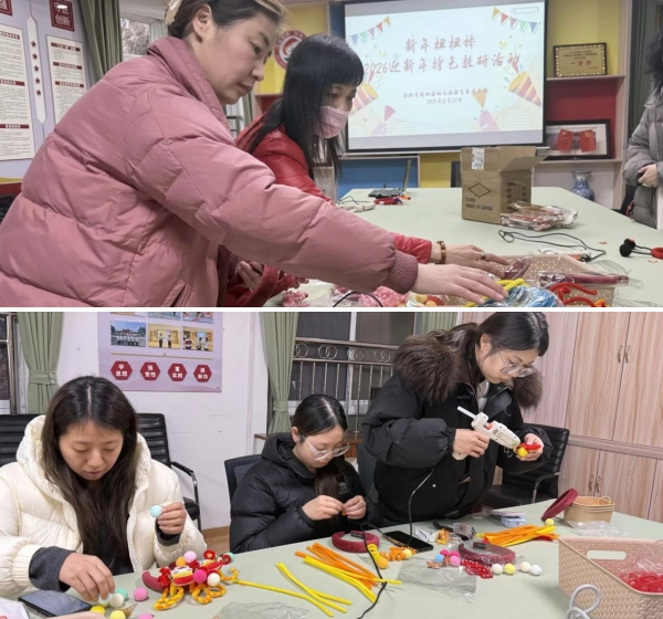 活动在温馨愉悦的氛围中拉开帷幕,走进创作现场,只见老师们全情投入,巧思涌动。一根根色彩鲜艳的扭扭棒在老师们灵巧的手指间缠绕、弯曲、编织、固定。有的老师构思出萌趣可爱的卡通生肖造型,寓意新年吉祥;有的老师组合出绚丽的花朵与闪烁的“星星”,象征欣欣向荣;还有的老师巧妙融入雪花、灯笼等新年元素,寄托美好祝愿。大家不时交流配色方案、探讨缠绕技巧,在互助协作中激发灵感,在欢声笑语中感受手工创作的魅力与团队教研的温暖。