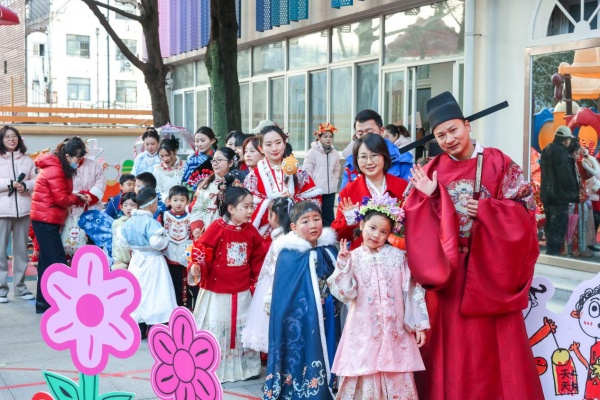 活动在大四班亲子传统服饰走秀中拉开帷幕。孩子们身着融入灯笼、剪纸、绒花、扎染等传统元素的汉服,自信登台,衣袂翩跹间尽显文化韵味,赢得阵阵掌声。
