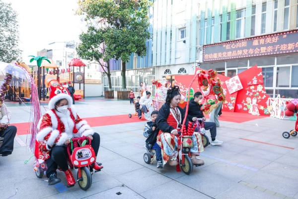 “花车巡游”队伍迎面走来,爸爸妈妈们化身“专属车夫”,跨上装饰一新的童车花车,孩子们稳稳坐在后座,笑逐颜开,亲子搭档们缓缓骑行,沿途洒下串串欢笑。
