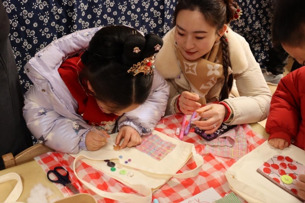 最热闹的还是“非遗布工坊”,和爸爸妈妈一起制作一个布艺的小发卡,小胸针,点缀专属节日的传达,再缝个包包摇身一变成最亮眼的小潮童。