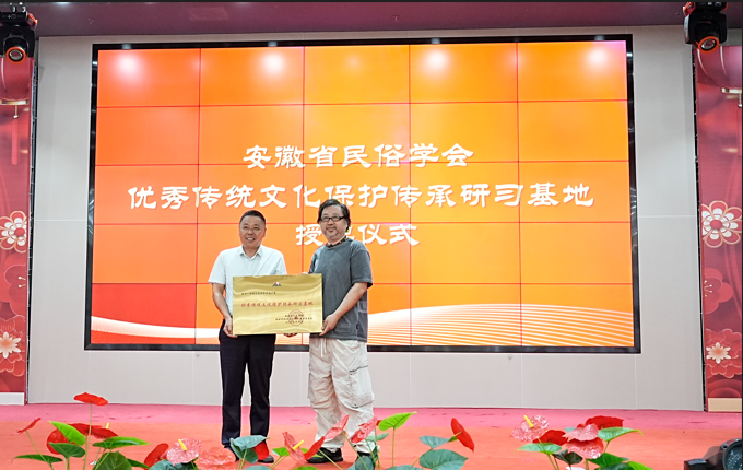 安徽省民俗学会副会长兼秘书长谭作春为舒城文翁研学旅游小镇“优秀传统文化保护传承研习基地”授牌。
