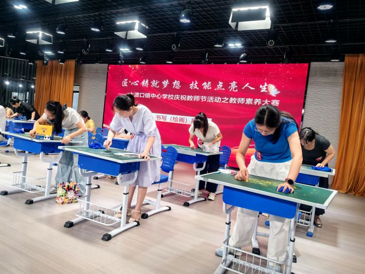 8:30 - 9:00 ,现场书写、绘画环节有序开展。工作人员按书写类别分发工具,选手们迅速进入状态。书写组以小学语文课本必备古诗词为内容,用钢笔、粉笔、毛笔展现楷书功底,行款规范、墨色匀称;绘画组自主选题,笔触间传递教育感悟。评委巡回观察,记录创作亮点,为后续评审积累素材。
