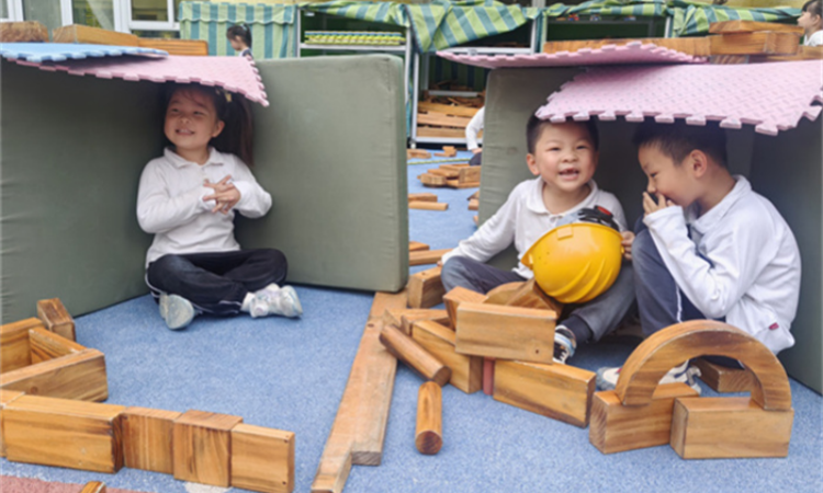 在自主游戏时间,孩子们转战操场,围绕大型碳化积木展开新一轮迷宫搭建。他们分工明确,协作搬运木板与方块积木,以绿色软垫为界规划墙体布局。风风负责拐角的精准搭建,沐沐放置“金币”增加趣味,远远设置障碍节点并兴奋地表示:“要让走迷宫的人在这里绕个圈!”在不断协商通道宽窄、调整路径曲直的过程中,一座融合木板、方块与弧形积木的立体迷宫最终落成。小翊热情邀请同伴试走,体验自己设计的趣味路径。