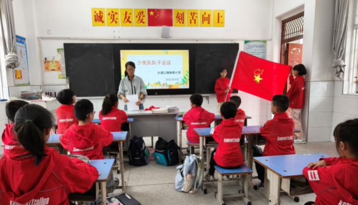 队旗与队徽是少先队的象征与标志。会上,辅导员操丹丹老师通过图文结合的方式,详细介绍队旗的红色象征意义、五角星与火炬的内涵,以及队徽的设计元素,让队干们深刻理解少先队组织的光荣历史与精神传承。最受关注的“红领巾佩戴教学”环节中,辅导员手把手演示正确佩戴步骤,纠正常见错误,确保每位队干都能标准佩戴,并承担起“教同学、帮同学”的责任。