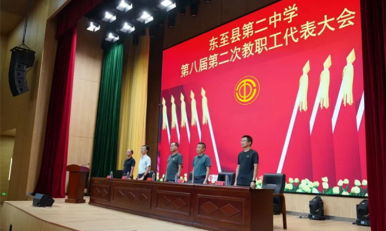 在完成所有预定议程后,大会举行闭幕式。全体代表起立,奏唱《国际歌》,东至县第二中学第八届教职工代表大会第二次会议在庄重的氛围中圆满落幕。