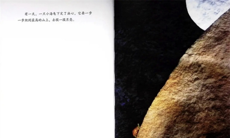 有一天,一只小海龟下定了决心,它要一步一步爬到最高的山上,去摸一摸月亮。