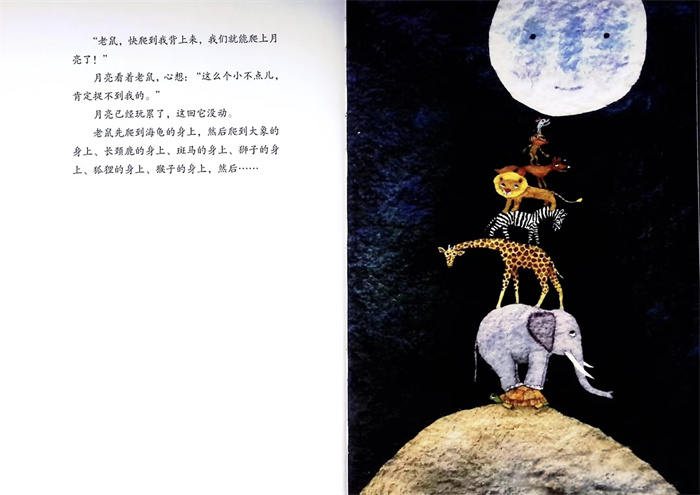 “咋嚓!”它咬下一片月亮。月亮的味道真好,值!然后,老鼠又给猴子、狐狸、狮子、斑马、长颈鹿、大象和海龟,都分了一口月亮。