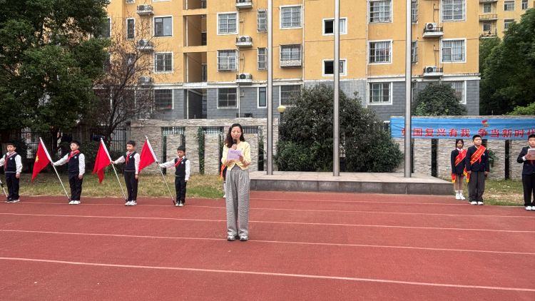 晨风轻拂,秋意微凉,全校师生齐聚操场,举行“强国复兴有我,争当新时代好少年”主题升旗仪式。在庄严的国歌声中,五星红旗冉冉升起,全体师生肃立注目。随后,大队辅导员郑云老师发表了题为《站在少先队建队76周年的新起点上》的国旗下讲话,她回顾了少先队的光辉历程,勉励队员们珍惜荣誉、牢记使命,努力成长为担当民族复兴大任的时代新人。