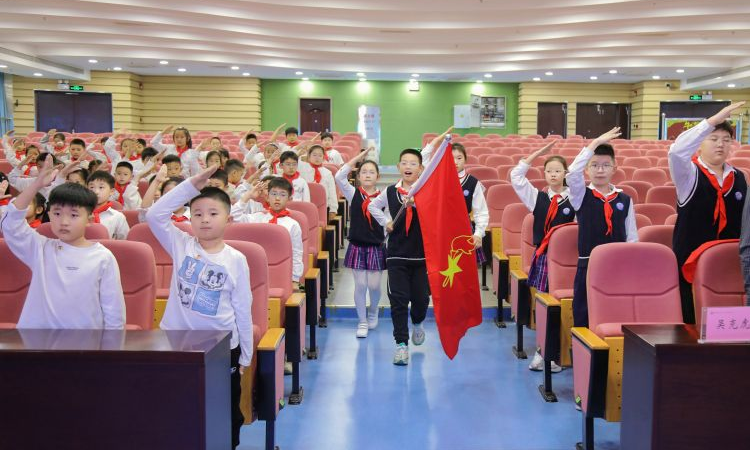 下午2时,在艺体楼三楼报告厅隆重举行新队员入队仪式。在庄严的出旗曲中,旗手高举队旗步入会场,全体队员齐唱《中国少年先锋队队歌》。大队辅导员陶然老师宣读名单,共有103名新队员光荣加入中国少年先锋队。老队员为他们佩戴上鲜艳的红领巾,新队员在队旗下庄严宣誓,铿锵誓言回荡在整个会场。