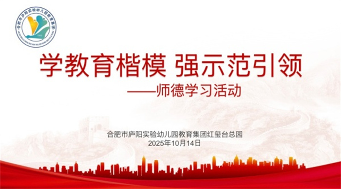 为进一步加强教师队伍的职业道德建设,弘扬高尚师德,2025年10月14日,合肥市庐阳实验幼儿园教育集团红玺台总园组织开展了主题为“学教育楷模 强示范引领”的师德师风专题学习活动.