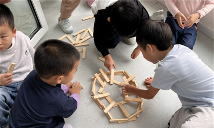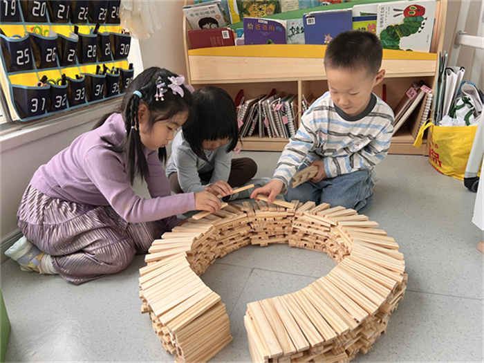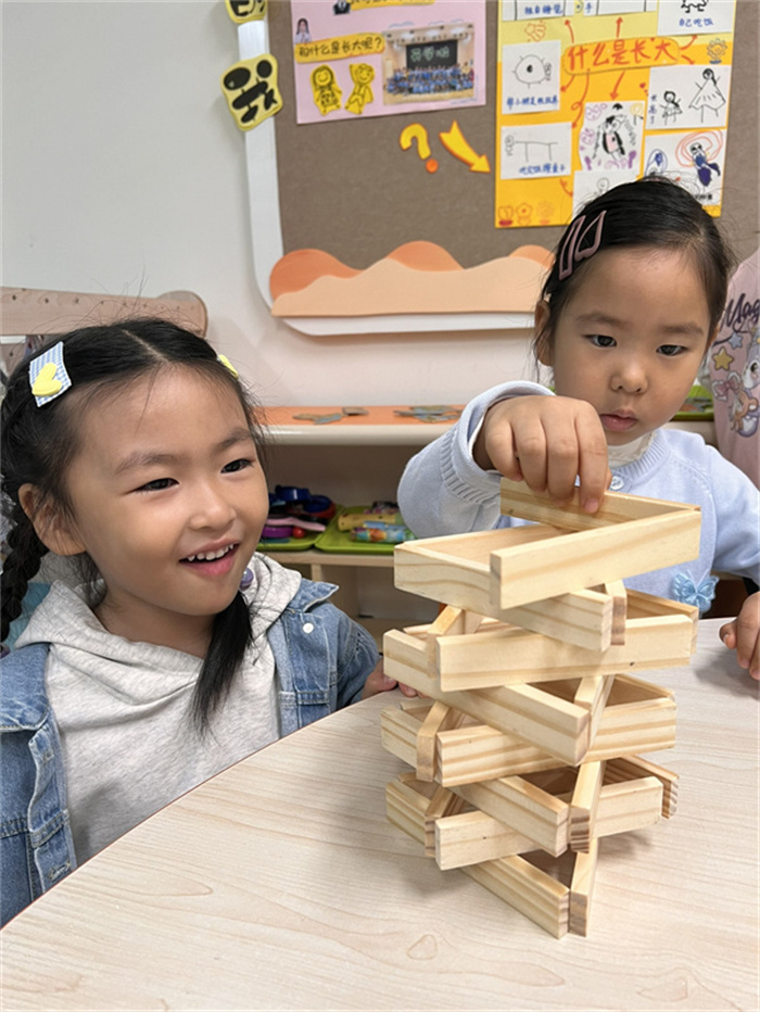 幼儿不再满足于搭出来,而是开始思考怎样搭得更高、更稳。从盲目堆高转向有意识地增强结构稳定性,这是建构思维的重要飞跃。